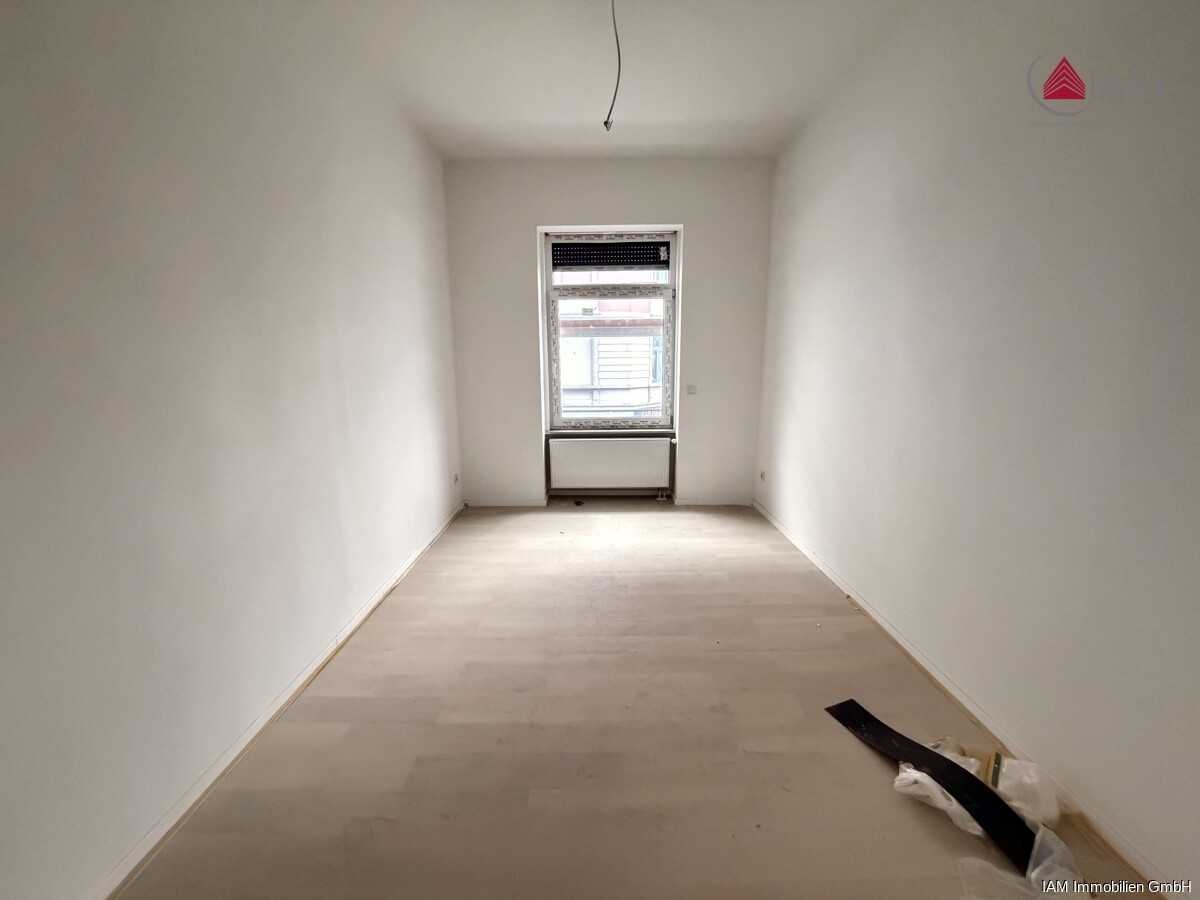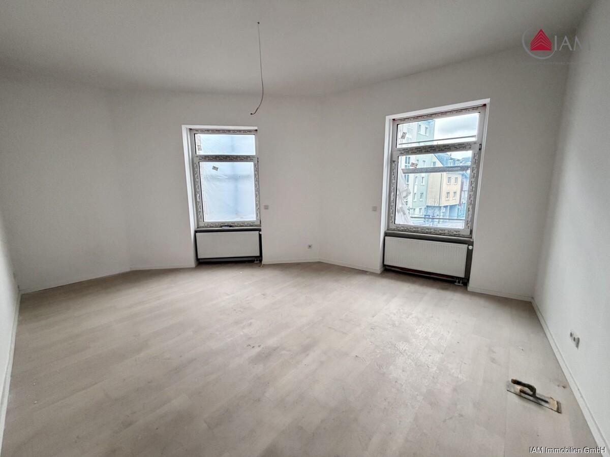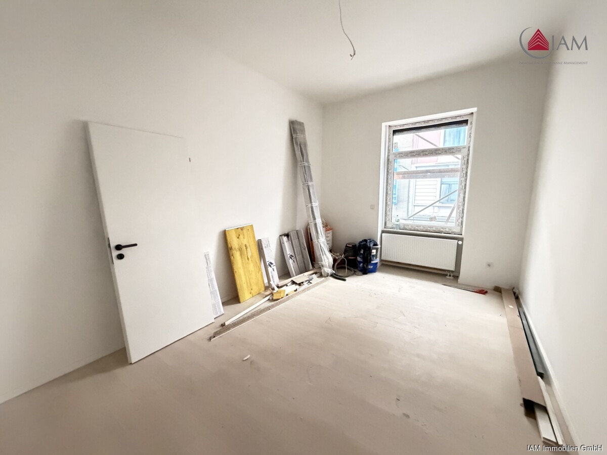 Rechtsseitig öffnen sich drei helle Zimmer, die flexibel als Schlafbereich, Arbeitszimmer oder Kinderzimmer genutzt werden können. Das Wohnzimmer bildet den zentralen Mittelpunkt der Wohnung. Durch die große Fensterfront wirkt der Raum lichtdurchflutet und bietet eine freundliche Wohnatmosphäre.Die gesamte Wohnung befindet sich in einem umfassend kernsanierten Zustand. Auch das Gebäude wird vollständig erneuert und mit modernen Materialien sowie zeitgemäßer Technik ausgestattet.