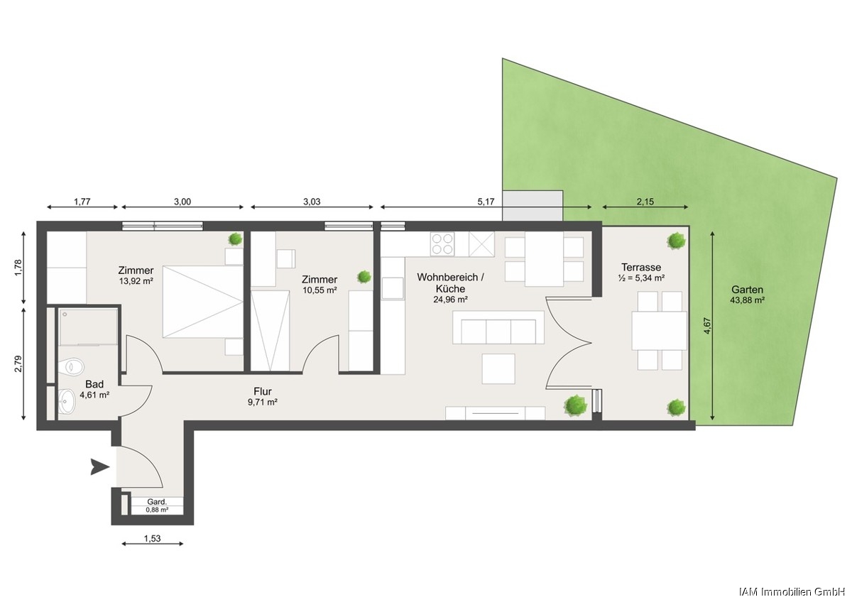 Vom Eingangsfoyer betritt man die helle Wohnung. Durch die Verbindung der offenen Raumgestaltung des Wohn- und Esszimmers mit offener Küche, verfügt die Wohnung sofort über ein besonderes Wohnambiente. Vom WEK-Bereich haben Sie den Zugang zur großzügigen Terrasse und Garten. Durch den Einbau der Heizstrahler, können Sie auch an kühlen Tagen Ihren Garten genießen.
